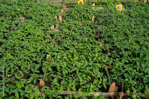 Seedlings of tomatoes and paprika in greenhouse, agriculture farming