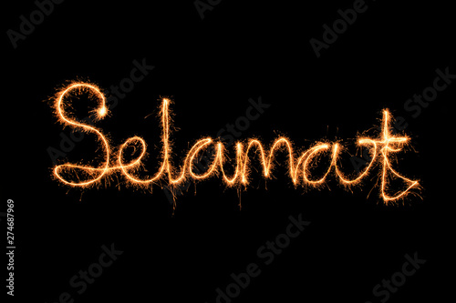 Selamat written in sparkle fire on black background