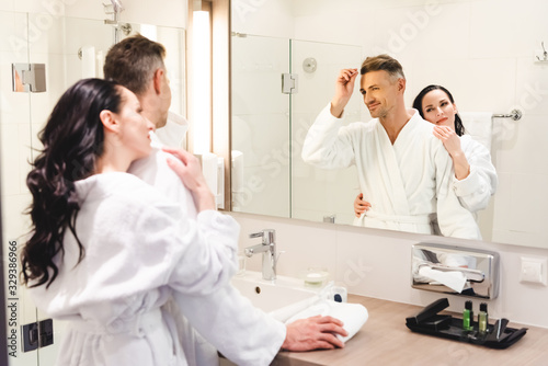 selective focus of boyfriend combing hair and smiling girlfriend hugging him in hotel