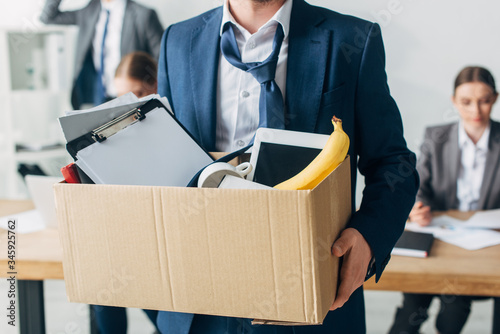 Selective focus of dismissed man holding cardboard box with papers, digital tablet and banana in office