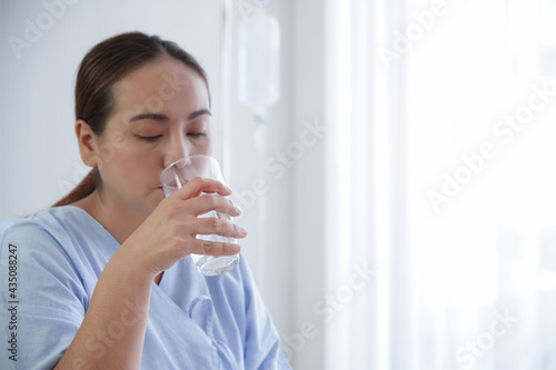 Selective focus on Asian young patient woman's hand holding a glass of water. She is drinking pure water and sitting on bed with saline bag in hospital room.
