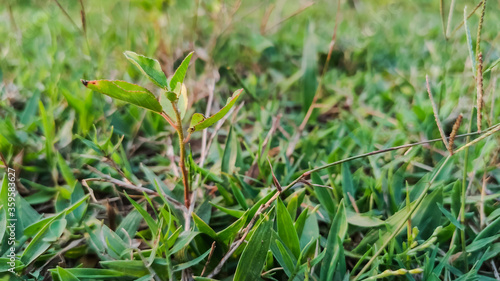 selective focus on green small leaves of plant in grass