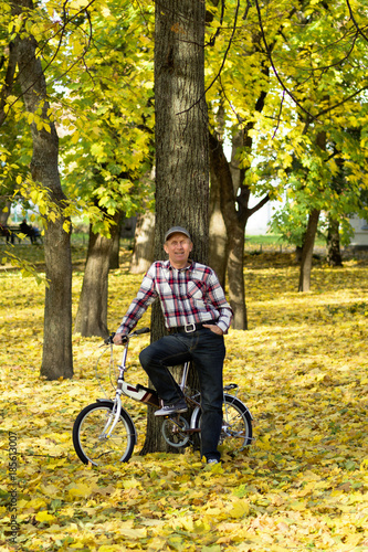happy, senior, bicycle, in, autumn, park, man, male, tree, leaf, leaf, gold, yellow, colours, landscape, wood, forest, old, nature, maple, oak, to sit, rest, mind, head, outlet, bike, wheel, inspiration