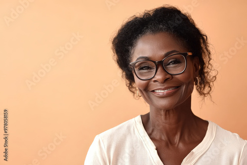 Senior Black woman with glasses, smiling kindly, standing against a soft light orange background, projecting warmth and experience.