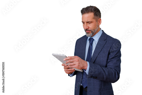 Senior businessman holding a tablet, engaging with technology. He is focused while using the device, on transparent background