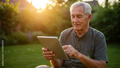 Senior Caucasian man using tablet device outside on lawn. Warm sunset light, peaceful mood. Leisure activity, staying connected and modern communication.