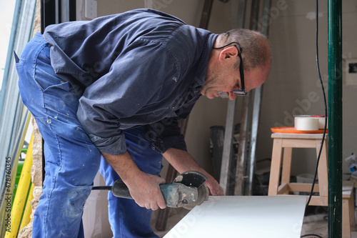 senior, contractor, men at work, cut, tile, radial, saw, fit, hole, switch, box, white, ceramic, tile, wall, home, renovation, build, new, house, work, installing, improvement, man, material, professional, constructor, tiler, cement, brick, bricklayer, handyman, bathroom, job, residential, repairing, workplace, mason, working man, mortar, manual, profession, real, elder, aged