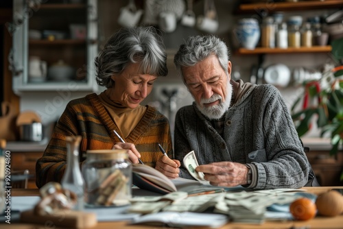 couple, elderly, planning, finance, budget, retirement, money, cash, dollar, bill, checkbook, notebook, pen, writing, home, kitchen, table, kitchen table, wooden table, sitting, indoor, interior, mature, savings, investment, senior, old age, lifestyle, domestic, household, family, husband, wife, domestic life, domesticity, home interior, real people, caucasian, finance, financial, adult, mature adult, family life