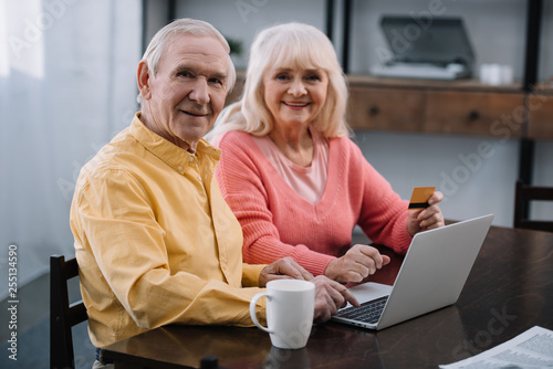 senior couple sitting on couch with laptop and credit card, looking at camera and doing online shopping at home