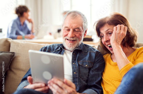 Senior couple using tablet in community center club.