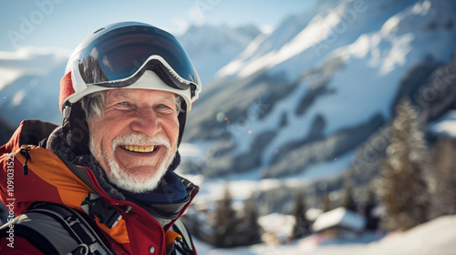 Senior elderly man with beard smiling snowboarder radiating joy and enthusiasm. Passion, exhilaration, and love for winter sports in the expression of the subject