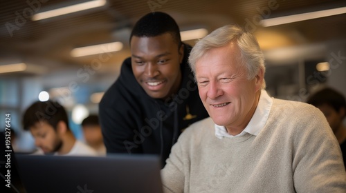 Senior man attending computer coding class in bright community center, instructor helping with laptop programming basics beside younger students, ideal for lifelong learning technology education