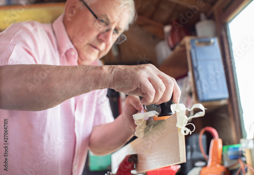 man, senior, carpenter's shop, carpenter, plane, wood, planing, tool, craftsman, hobby, retired, retirement, shed, garden shed, workshop, making, building, bricolage, skill, tradition, senior, enjoyment, working, one person, person, people, caucasian, man, male, 70s, 70s, active retirement, horizontal, shaving, expertise
