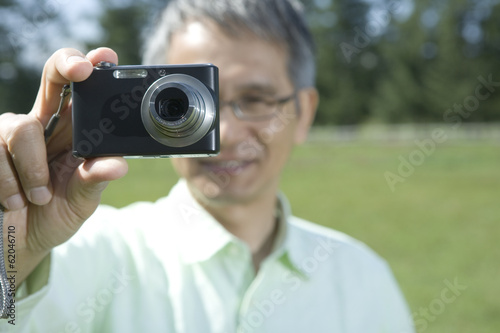 senior man holding camera