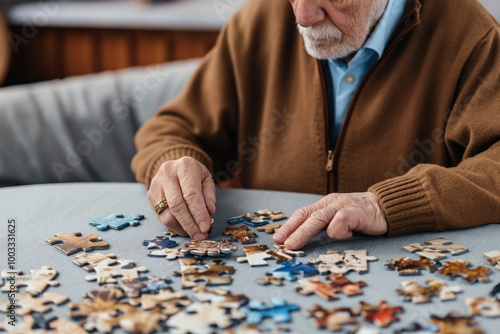 Senior man plays with jigsaw puzzle on table in living room. Person with grey hair concentrates on fitting pieces together. Casual attire, relaxed atmosphere.