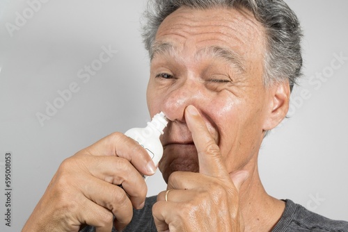 adult, allergy, closeup, drop, dry, face, head, health, health care, disease, indoor, inhaling, irritation, man, mature, medicals, medicine, nasal, nose, problem, relief, senior, spray, treatment