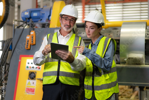 Senior manager train female technician working in metalwork production factory. Industrial engineer teamwork standing in manufacturing facility talking machinery maintenance in heavy steel industry.
