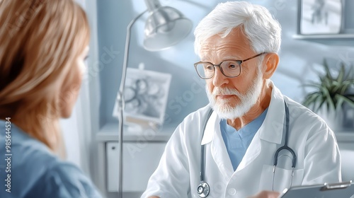 doctor, nurse, patient, medicals, health care, exam, senior, elderly, minimalist, decor, office, soft, sharpened, ink, laundered, painting, style, routine, attentive, listening, fantasy, art, care, treatment, consultation
