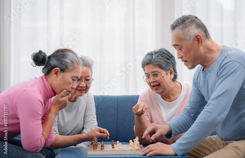 Senior people playing chess board game on sofa. Senior lifestyle at home. Strategy, management and leadership concept.