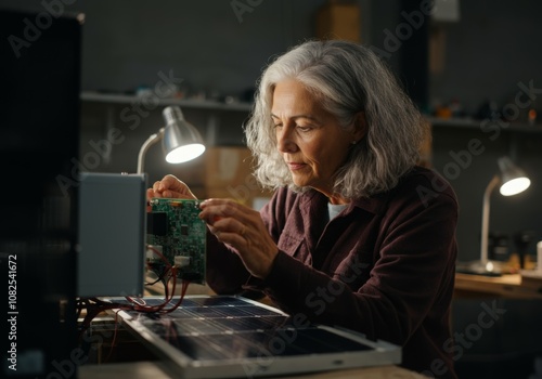 senior, woman, engineer, sustainable, technology, solar, panel, circuit, board, laboratory, workshop, grey hair, focused, electronic, renewable, energy, development, design, professional, technician, mature, electronic, component, wiring, green, industry, creative, workspace, invention, lighting, scientific, desk, power, engineering, research, expertise, modern, innovation