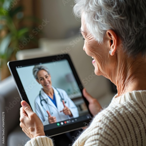 Senior woman smiles during video call on tablet. She is engaged in telehealth consultation with doctor. Cozy home environment with living room, plant. Comfortable couch, window add to atmosphere.