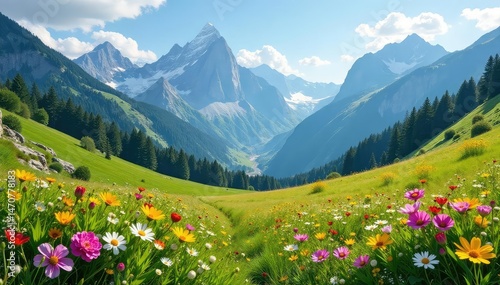 Serene alpine meadow nestled amongst towering mountain peaks, wildflowers in bloom , mountains, high altitude, shadow
