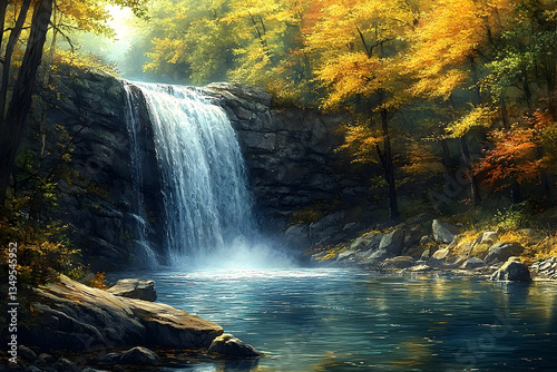 Serene autumn waterfall cascading into a tranquil pool, surrounded by golden foliage and sunlit rocks