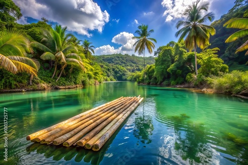 Serene bamboo raft glides through turquoise waters of Blue Lagoon in Jamaica, surrounded by lush green vegetation and majestic palm trees under a sunny sky.