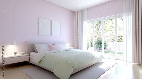 Serene bedroom, pastel walls, garden view, sunlight. Home decor inspiration
