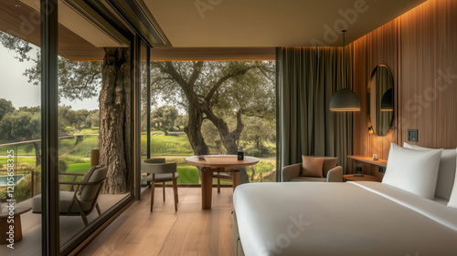 bedchamber, modern, serene, wooden, greenery, view, cosy, furniture, natural, light, tree, interior, design, relaxing, peaceful, hotel, contemporary, stylish, comfort, space, decor, landscape, nature, window, seating, table, chair, minimalist, elegant, bright, inviting, tranquil, soft, warm, atmosphere, luxury, retreat, vacation, get-away, ambience, roomy, home, relaxation, aesthetic, scenery, architecture, room, beautiful