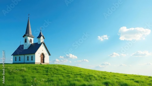 Serene blue sky above a peaceful church Perfect for religious, spiritual, or inspirational projects , sun, bright, hope