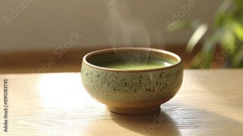 Serene Bowl of Hot Green Tea with Steam Rising, Natural Lighting on Wooden Surface, Inviting Atmosphere for Relaxation and Mindfulness Moments