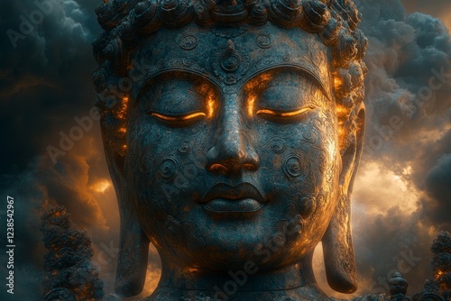 Serene Buddha statue amidst fiery clouds