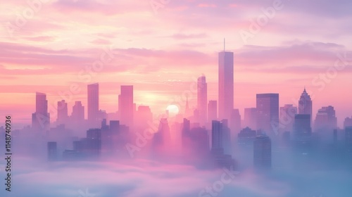 Serene Cityscape at Sunset with Pink and Purple Sky Hues