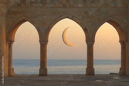crescent moon, arch, column, ocean, sea, sunset, sunrise, calm, peaceful, serene, tranquil, beige, brown, golden hour, romantic, mystical, magical, dreamy, mediterranean, coastal, landscape, travel, vacation, serenity, solitude, religious, spiritual, islam, faith, hope, natural light, twilight, sky, horizon