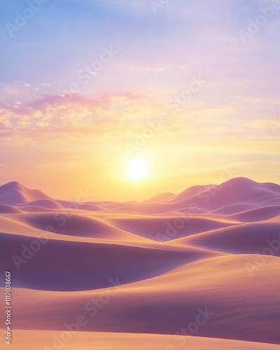 Serene desert landscape at sunrise with soft, rolling sand dunes.