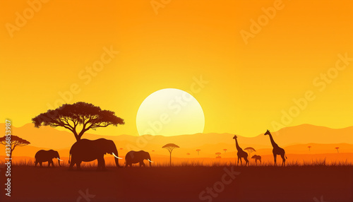 Serene elephants and giraffes in savannah at sunset, nature's beauty