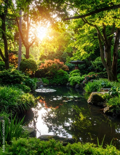 Serene garden pond reflecting sunlight, lush greenery, and tranquil atmosphere