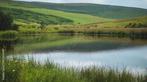 Serene Highland Lake with Reflective Water, Surrounded by Rolling Green Hills and Grazing Deer