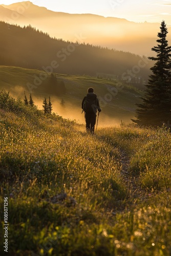 hiking, nature, sunset, landscape, mountain, person, trail, walking, adventure, solitude, exploration, outdoors, grass, wilderness, warm light, silhouette, serenity, fog, tree, shadow, journey, peaceful, scenic, horizon, activity, environment, freedom, summer, healthy lifestyle, recreation, calmness, path, beautiful, connection, scenery, vibrant, walking stick, fresh air, escape, natural beauty, sunlight, rural, wildlife