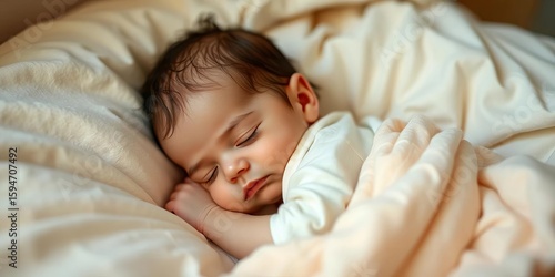 Serene infant nestled in soft bedding, peaceful slumber, newborn, precious