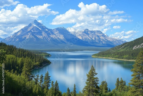 mountain, lake, sky, cloud, tree, blue, water, nature, landscape, scenic, view, peak, forest, coniferous, greenery, serene, peaceful, tranquil, majestic, panoramic, wilderness, summer, sunlight, daylight, horizon, alpine, huge