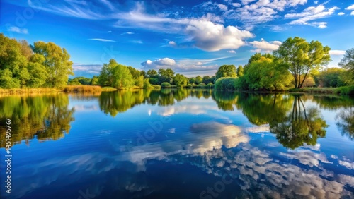 Serene lake on a clear day with a reflection of sky and trees, natural scenery