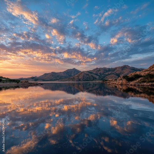 Serene lake reflecting a vibrant sunrise. Sunrise colors reflected in calm waters, with fluffy clouds mirroring in the still lake surface. Rolling hills flank the lake