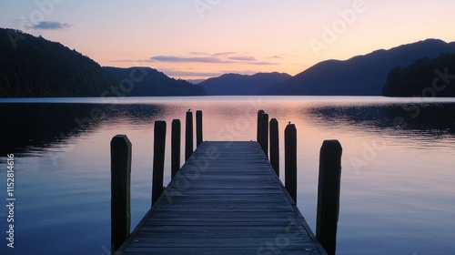 Serene Lake View from Wooden Pier at Sunset with Mountain Silhouette