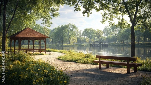 park, nature, landscape, lake, gazebo, tree, bench, calm, relaxing, sunny, day, greenery, peaceful, scenery, summer, foliage, natural, quiet, open space, river bank, path, environment, scenic, tranquil, resting, fresh air, outdoors, flower, plant, open, clean, shadow, clear, recreation, view, leisure, serene, escape, fresh, open air, wood, calmness, water, sunshine