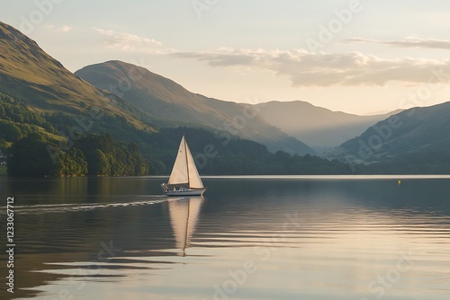 sailing, lake, mountain, calm, peaceful, sunset, nature, water, boat, tree, tranquil, gold, light, still, view, scenic, horizon, idylli, serene