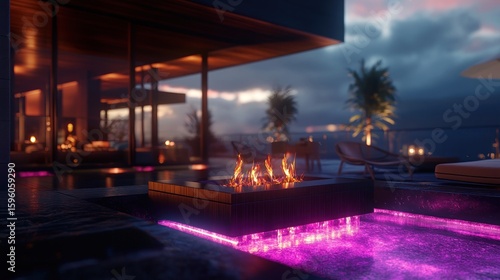 fire, pit, luxury, villa, modern, pool, water, architecture, design, exterior, home, residence, evening, twilight, illuminated, relaxation, peaceful, sky, cloud, deck, furniture, resort, lifestyle, building, house, property, real, estate, contemporary, poolside, tropical, palm, tree, vacation, sunset, neon, light, glow, reflections, warm, ambience, serene, escape