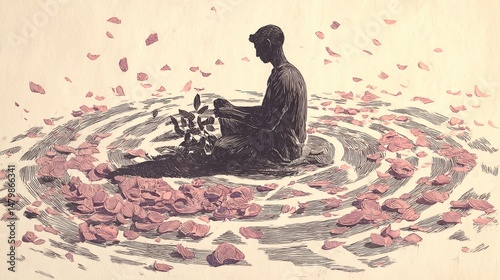 man, sitting, circle, flower petals, serene, peaceful, calm, meditation, relaxation, nature, flower, harmony, tranquil, beauty, mindfulness, zen, peacefulness, wellness, calmness, calmness