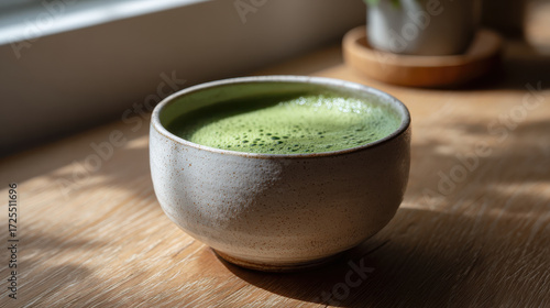 Serene matcha concept captured in simple bowl showcasing vibrant green hue and smooth texture of beverage